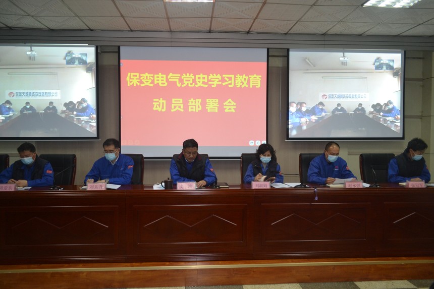 保变电气党委书记、董事长、公司党委党史学习教育领导小组组长文洪作动员讲话。保变电气党委副书记、总经理、党委党史学习教育领导小组副组长刘淑娟主持会议,并传达中央党史学习教育动员大会和兵器装备集团党史学习教育动员部署会精神。保变电气党委副书记、工会主席、公司党委党史学习教育领导小组副组长赵永强宣读保变电气《关于开展党史学习教育实施方案》,布置公司党史学习教育工作。保变电气党委副书记、同为公司总经理、公司党委党史学习教育领导小组副组长刘东升,党委委员、副总经理周爱东、张冠军参加。