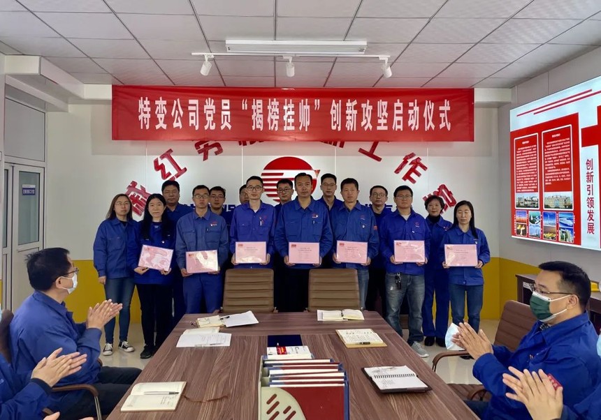 2021年4月26日,特变公司党委“揭榜挂帅”党建联建共建攻关启动仪式在戚红劳模创新工作室举行。会议指出,保变电气党委在特变公司开展党建联建共建“揭榜挂帅”创新攻关活动试点工作,旨在以党员“揭榜挂帅”担当作为,通过党支部 创新工作室共同攻坚克难、创新突破,解决难题创造佳绩,在企业爬坡攻坚中建功立业,为企业发展添砖加瓦,为党旗增光增色。会上,特变公司7位党员分别“揭榜”7项创新攻坚任务。这7项任务是各支部所辖工作中的难点、重点、堵点问题。